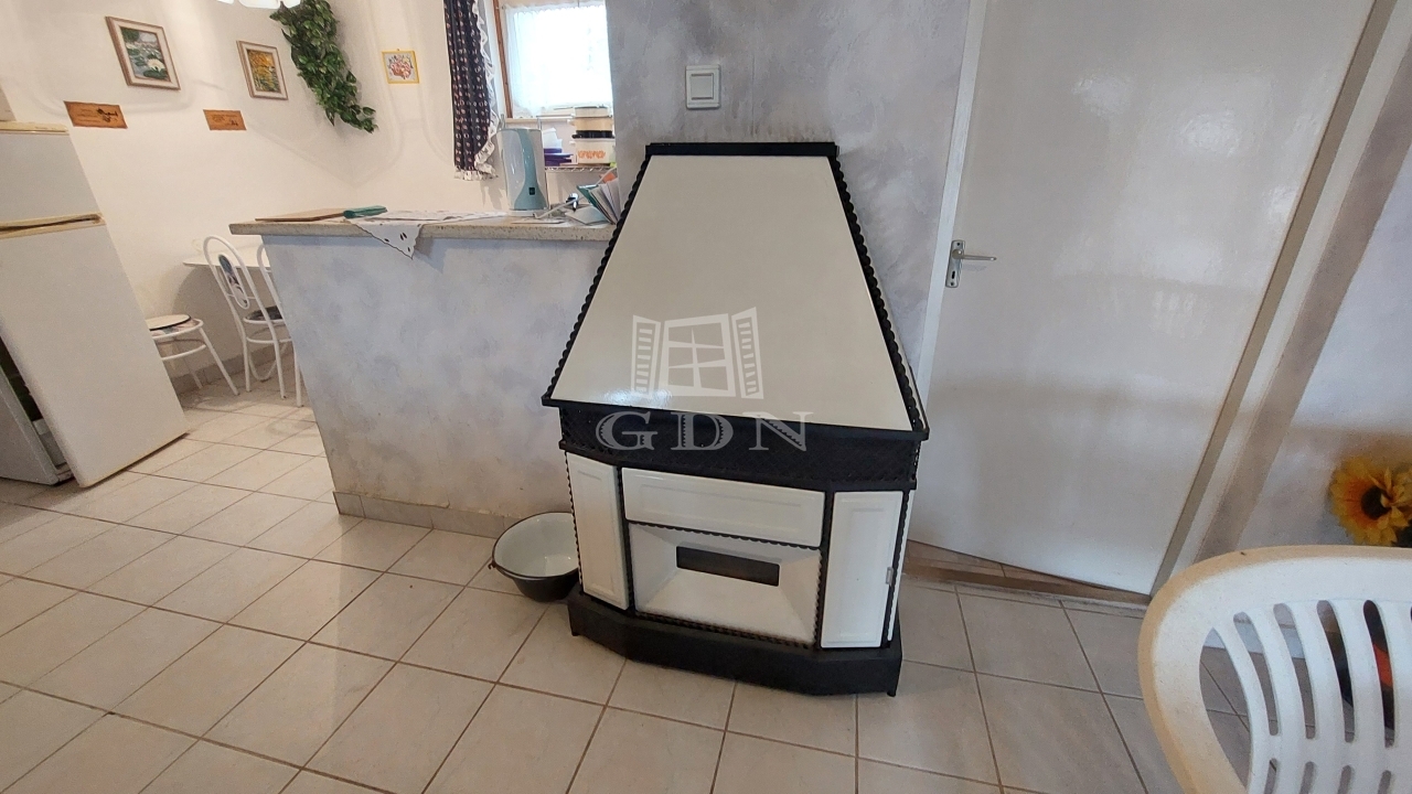 A főépület földszintje barátságos, élhető terekkel várja új tulajdonosát: két szoba, egy tágas nappali-étkező-konyha, fürdőszoba és külön WC kapott helyet. A nappali meleg hangulatáról télen gázkandalló gondoskodik. Az egész ház előtt végighúzódó, 24 m²-es fedett tornác ideális helyszíne lehet a reggeli kávéknak vagy a nyári beszélgetéseknek.