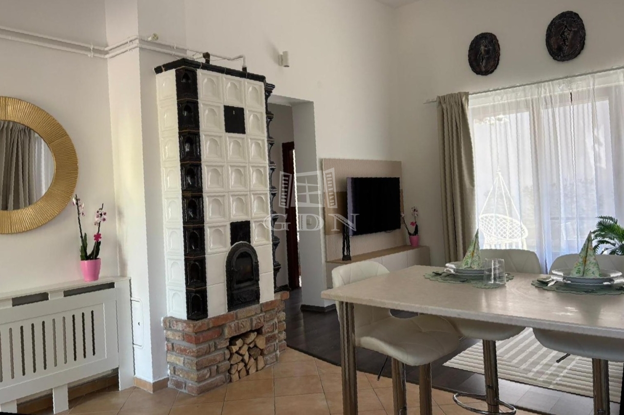 A nappali különlegessége a stílusos cserépkályha vízteres rendszerrel, amely nemcsak meghitt hangulatot teremt, hanem hatékonyan hozzájárul a ház fűtéséhez is. A fűtésről emellett gázkazán és radiátoros rendszer gondoskodik.