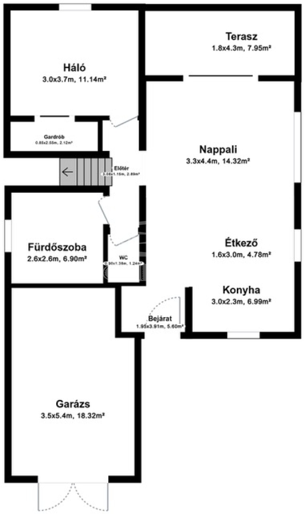 A földszinten egy tágas, világos nappali-étkező található amerikai konyhával, közvetlen kijárattal a fedett teraszra, ahonnan a gondosan kialakított, privát kertre nyílik kilátás. Ezen a szinten kapott helyet egy hálószoba gardróbbal, egy fürdőszoba, valamint egy zárt garázs is.