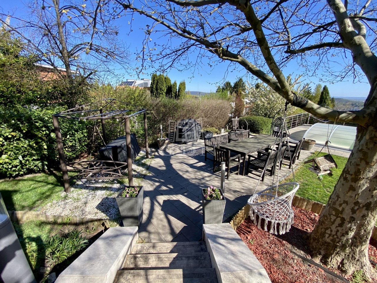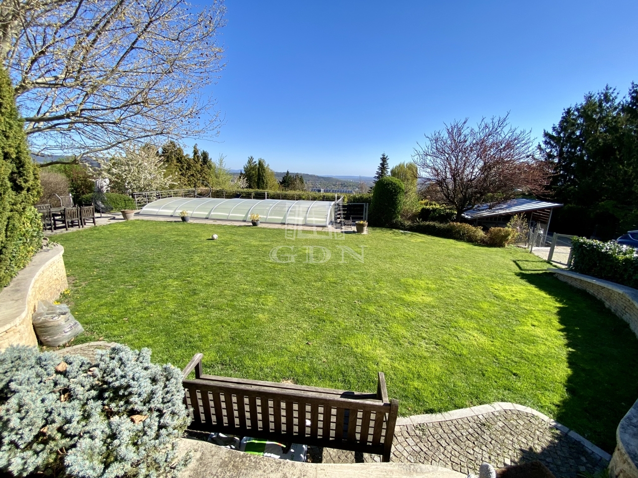 A 2000 négyzetméteres, intim telken elhelyezkedő, 443 négyzetméteres ingatlan elvehetetlen, örök panorámával rendelkezik.
