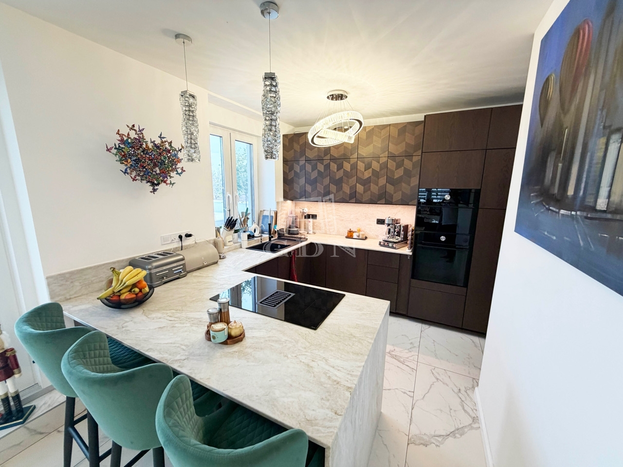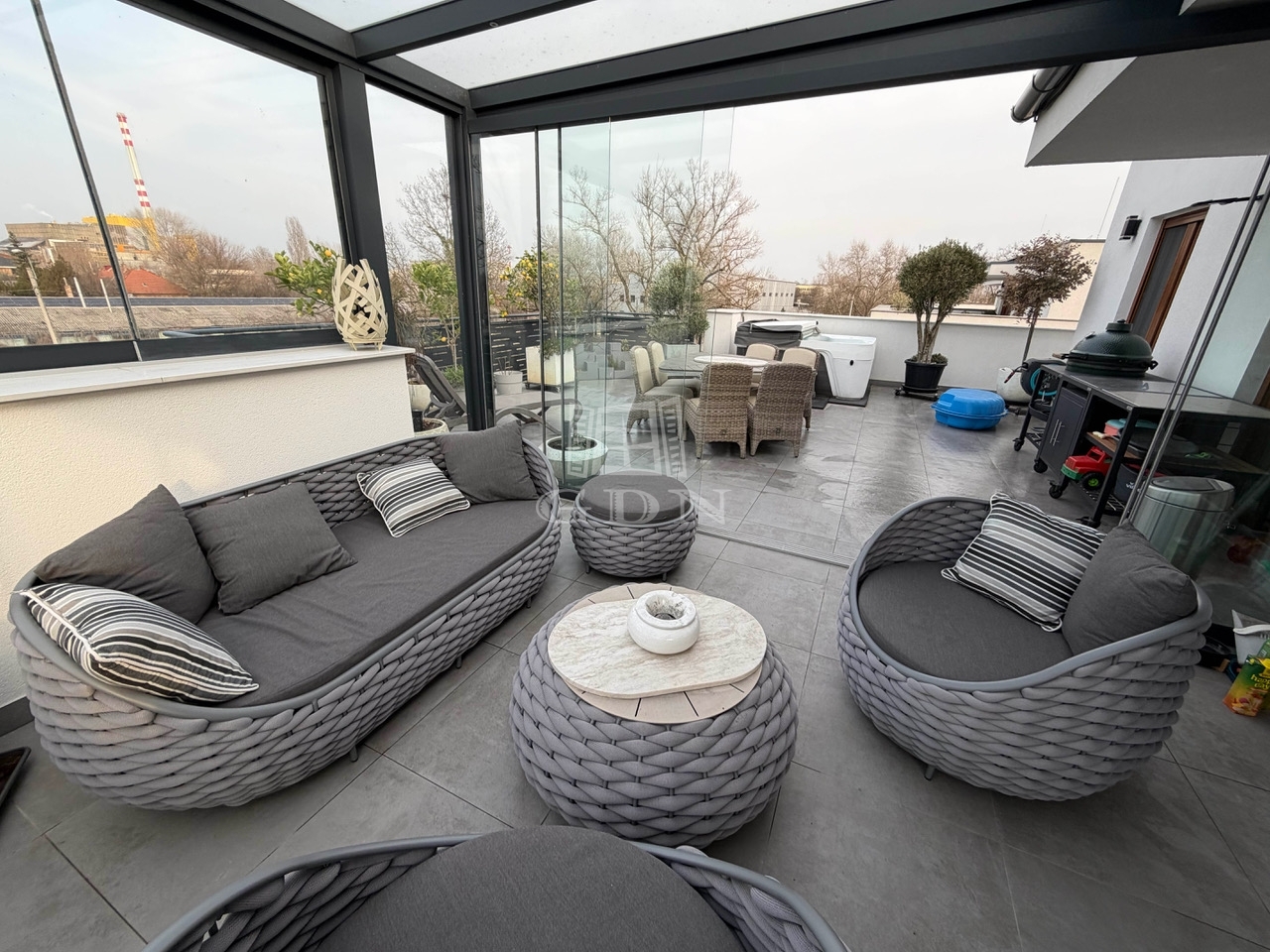 XV. kerület könnyen megközelíthető, kertvárosi részén, 2022-ben épített, szigetelt, kis lakásszámú, kertkapcsolatos társasház 2.emeletén eladásra kínálok, egy panorámás, impozáns állapotú-letisztult, egyedi méretű-beosztású, 166 m2 alapterületű, 116 m2-es erkéllyel, különnyíló szobákkal rendelkező, hőszivattyús padló fűtéssel és mennyezet hűtéssel, motoros alumínium redőnyökkel szerelt, alacsony fenntartású téglalakást.