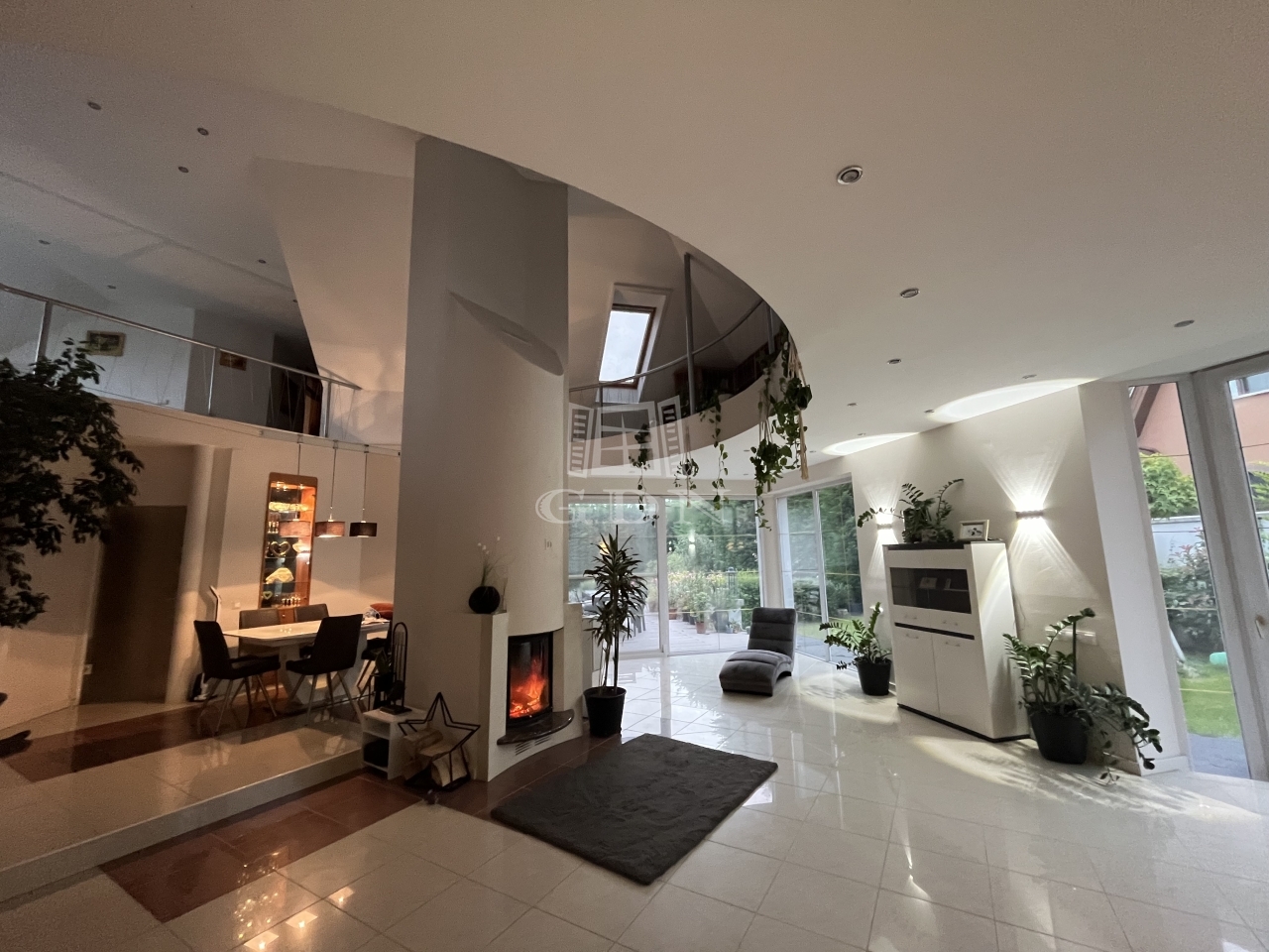 A ház tágas, világos, átriumos kialakítású, nagy üvegfelületekkel.