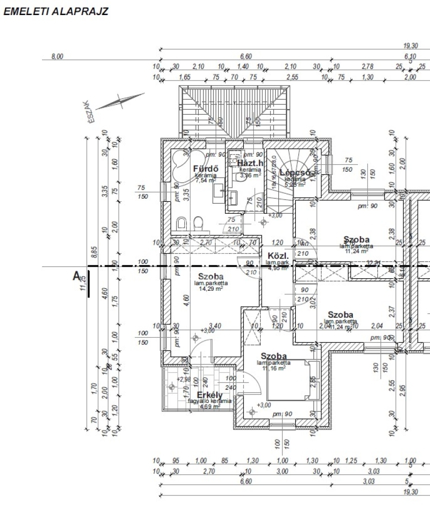 Az alaprajzhoz képest az emeleten a szülői hálószobából egy elegáns tükör tolóajtón keresztül közvetlenül is megközelíthető a fenti fürdőszoba, amely szintén prémium érzetet ad ennek a helyiségnek is.