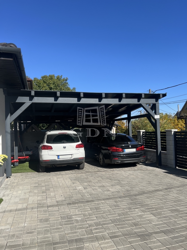 Az előkert teljes területe térkővel burkolt, így a garázson felül további 2 autó számára fedett beállási lehetőség biztosított.