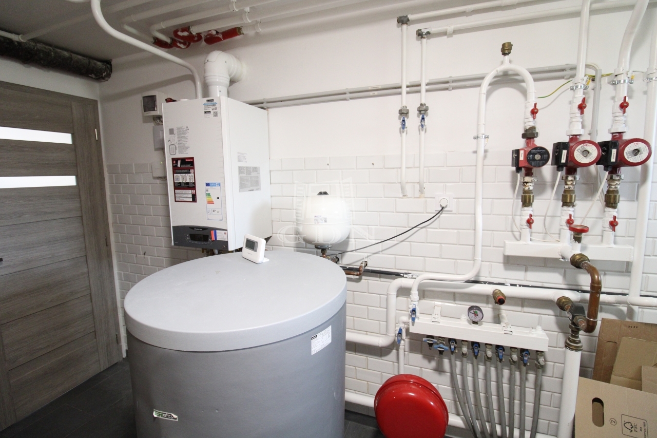 A ház központi fűtéséről és melegvíz előállításáról kondenzációs gázkészülék gondoskodik.