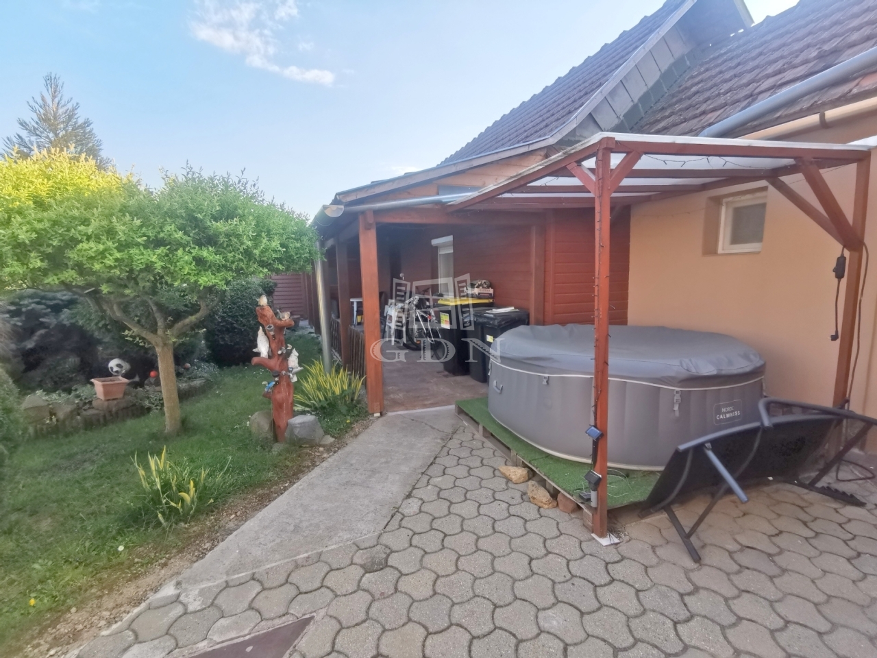 Az épület előtt fedett terasz található, ahol egy jakuzzi gondoskodik a mindennapi feltöltődésről.