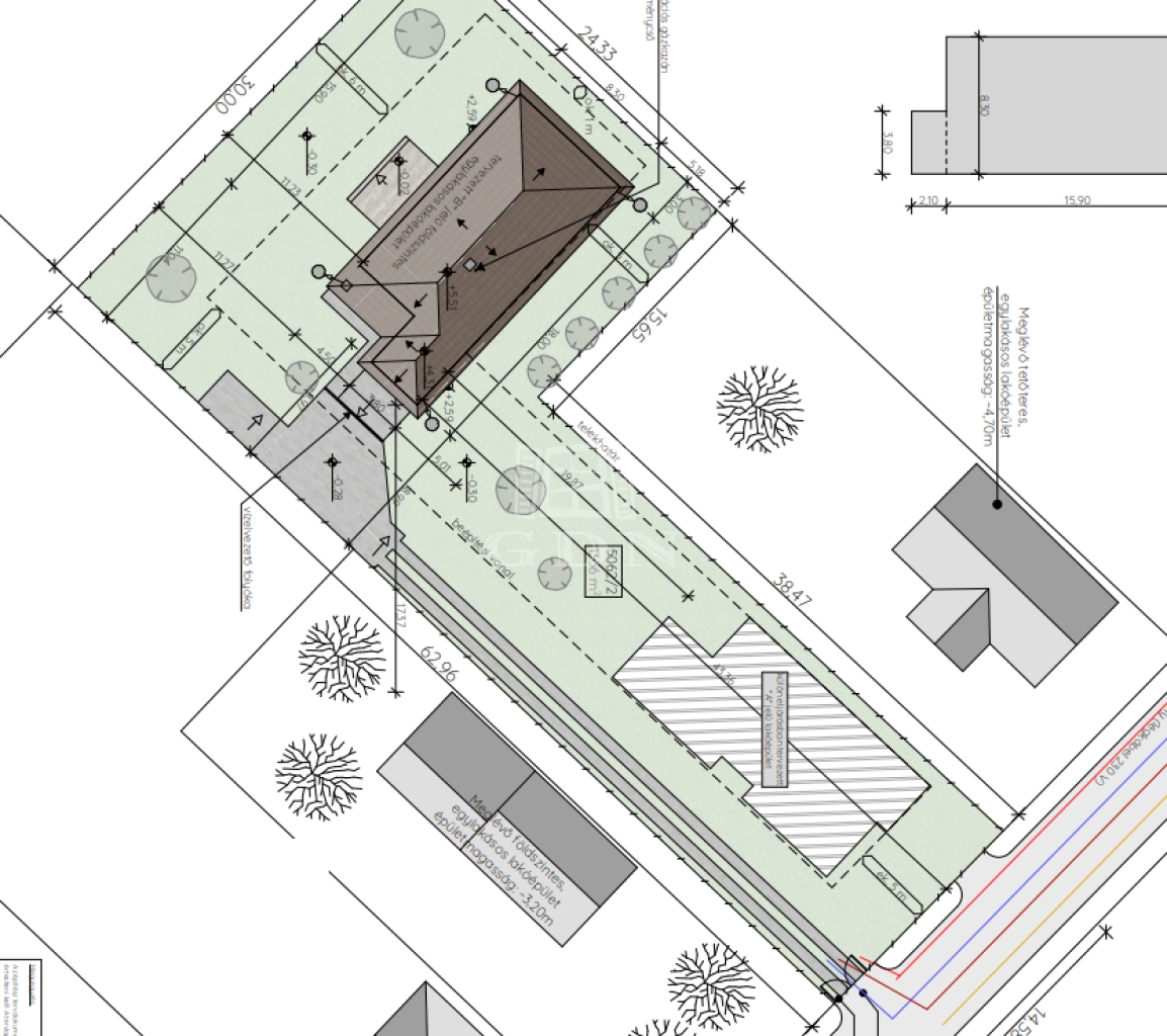 A telken két lakóház épül, közös fal nélkül, saját használatú telekrésszel, saját mérő órákkal, ügyvédi megosztási szerződéssel.