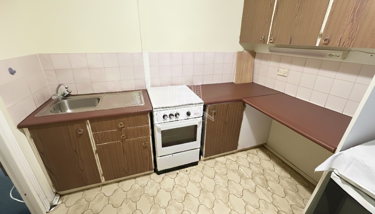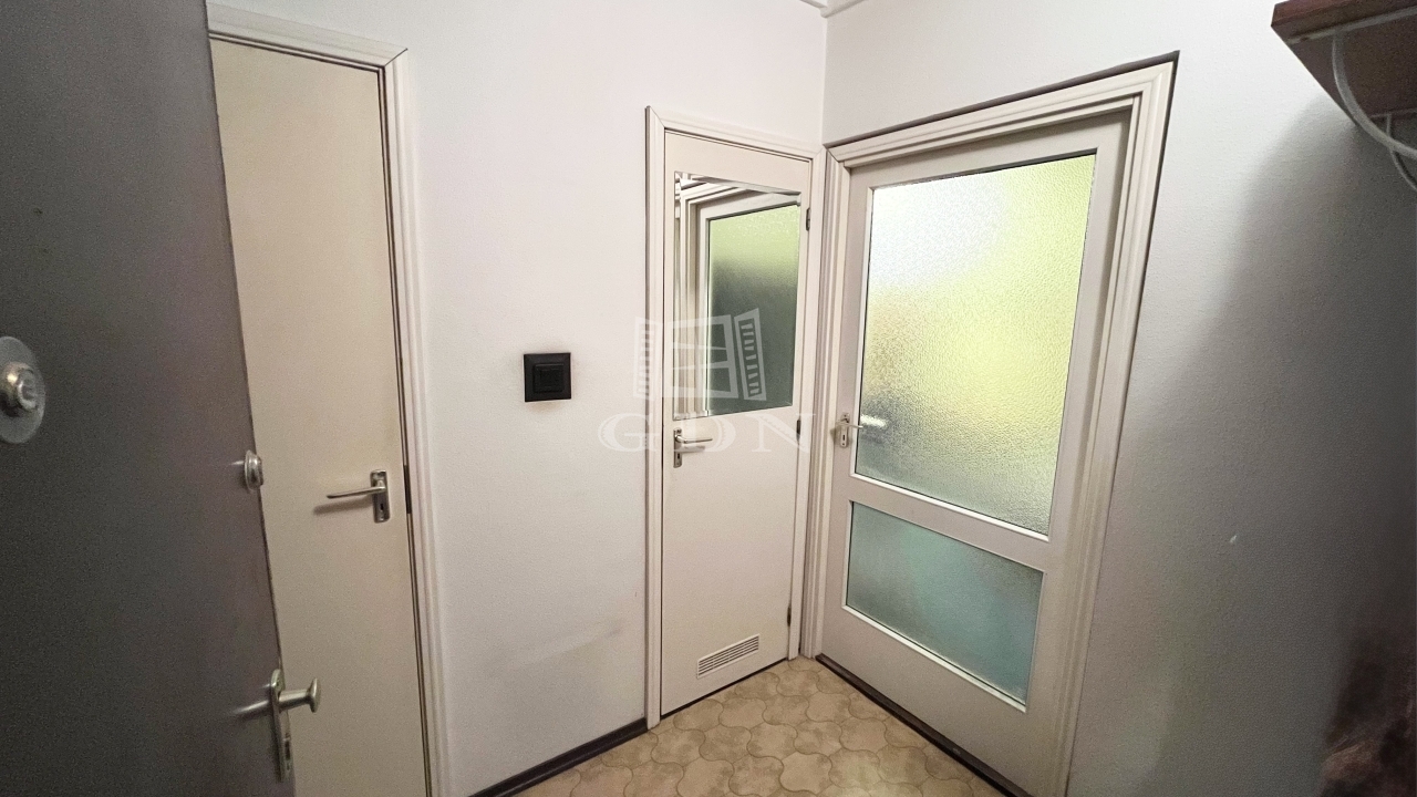 Az előszobából külön nyílik a fürdőszoba és a WC, itt kapott helyet egy beépített gardróbszekrény is. A tágas, padlószőnyeggel burkolt szobából nyílik a konyha, amely ablakos, konyhabútorral felszerelt.