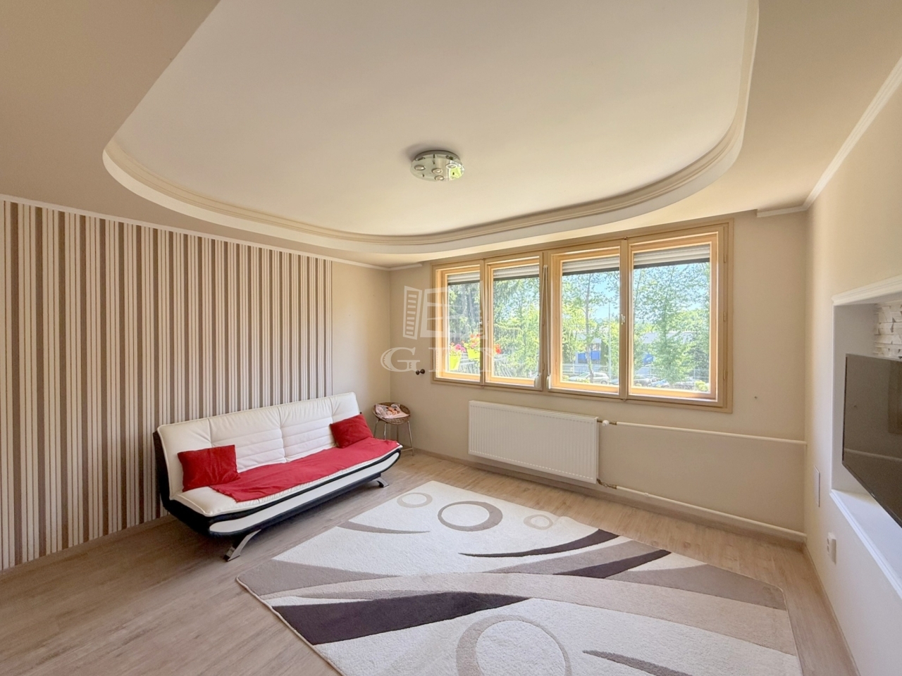 1. emeletén található egy nappali, kettő, külön nyíló tágas háló, melyből az egyik erkélykapcsolattal bír, egy káddal felszerelt fürdő, valamint egy külön helyiségben lévő toalett.
