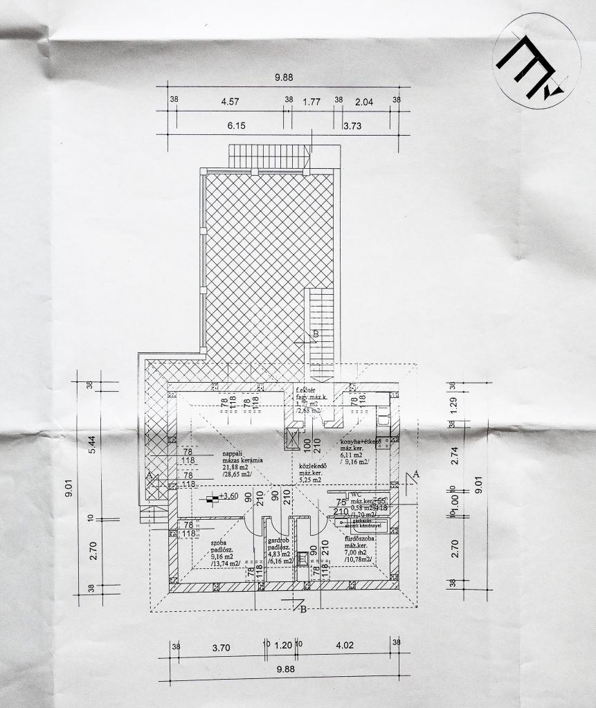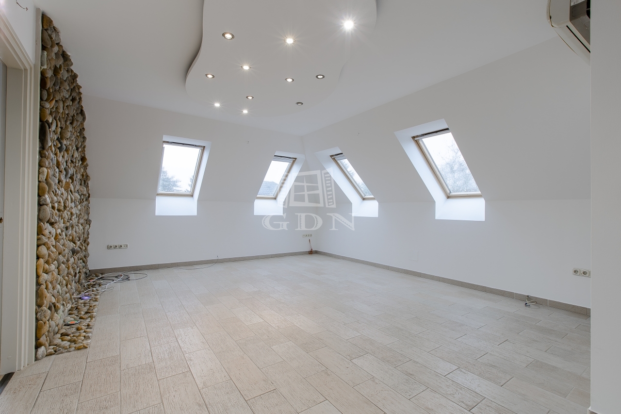 A főépület szuterén (48nm) és az alsó lakás (75 nm), 1980-as években épült, beton alapra 30-as tégla falazattal. 2009-ben ráépült beton födémmel és új tetővel egy külön bejáratú 56 nm-es lakás, illetve mellé épült egy 35 nm-es két állásos garázs elektromos garázskapuval, ami fölött 56 nm-es terasz került kialakításra. Ebben az időben kapott az épület körbe 7 cm dryvit szigetelést és új fa thermo nyílászárókat is.