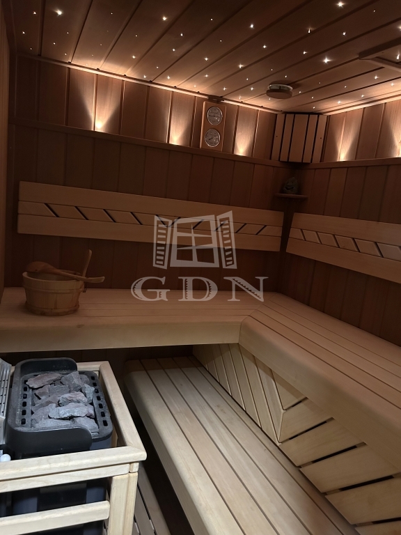 3 szintes, pincében, szauna, fürdő szoba, úszómedence, mosókonyha, 2 nagy tároló, beépített gardrób szekrények.