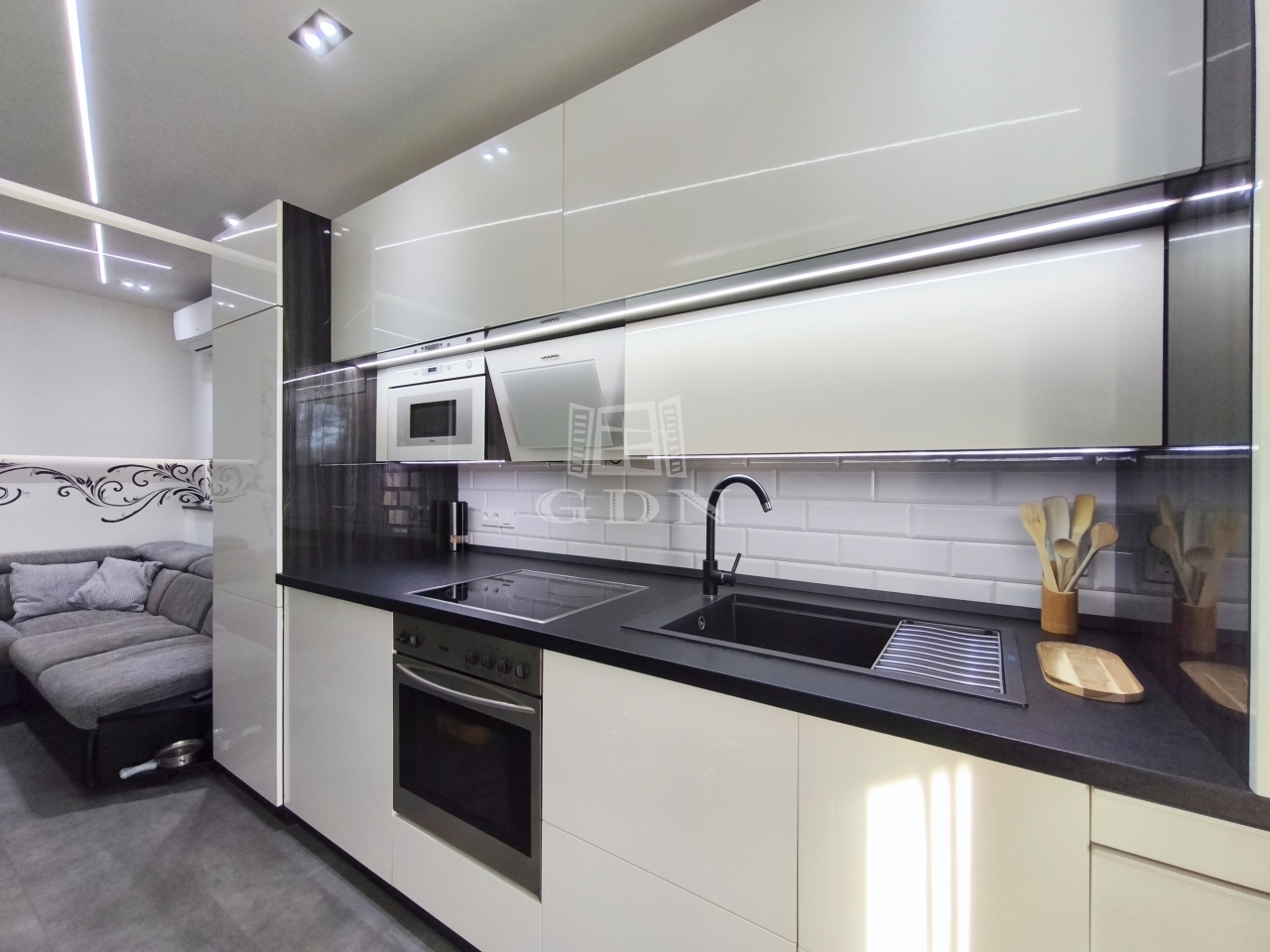 A gépesített, beépített konyha sütővel, hűtőszekrénnyel, mikrohullámú sütővel és kivezetett szagelszívóval felszerelt, így a lakás azonnal költözhető.