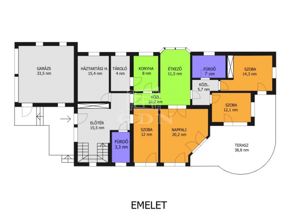A földszin és emelete hasznos lapterülete 280 nm + 39 nm terasz + 34 nm-es két állásos garázs. A tetőtér beépítése esetén, szép, különálló, panorámás lakrész alakítható ki. Az épület minden szintje egy közös lépcsőházból közelíthető meg.