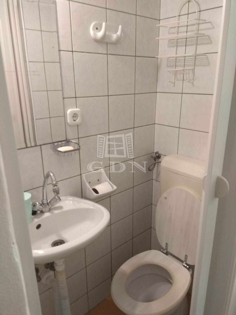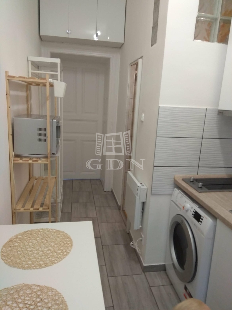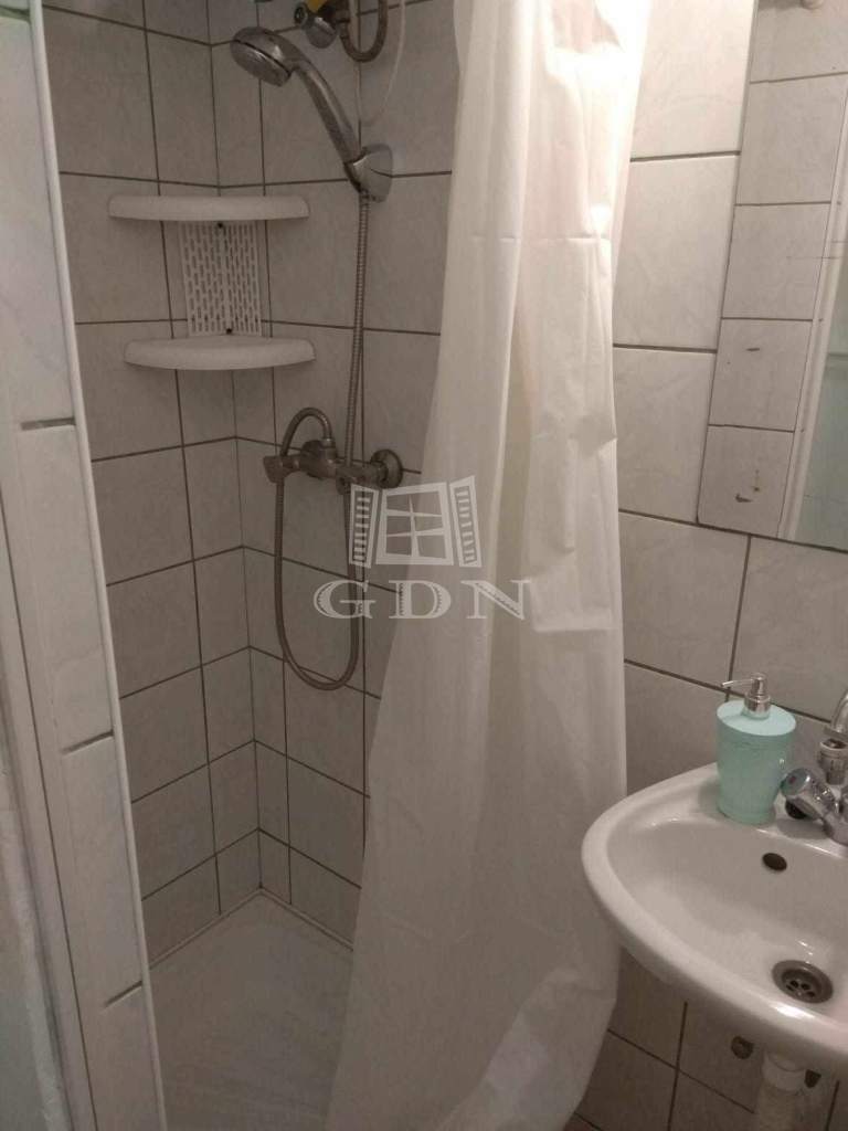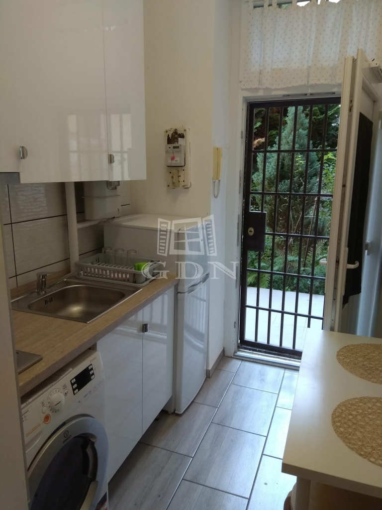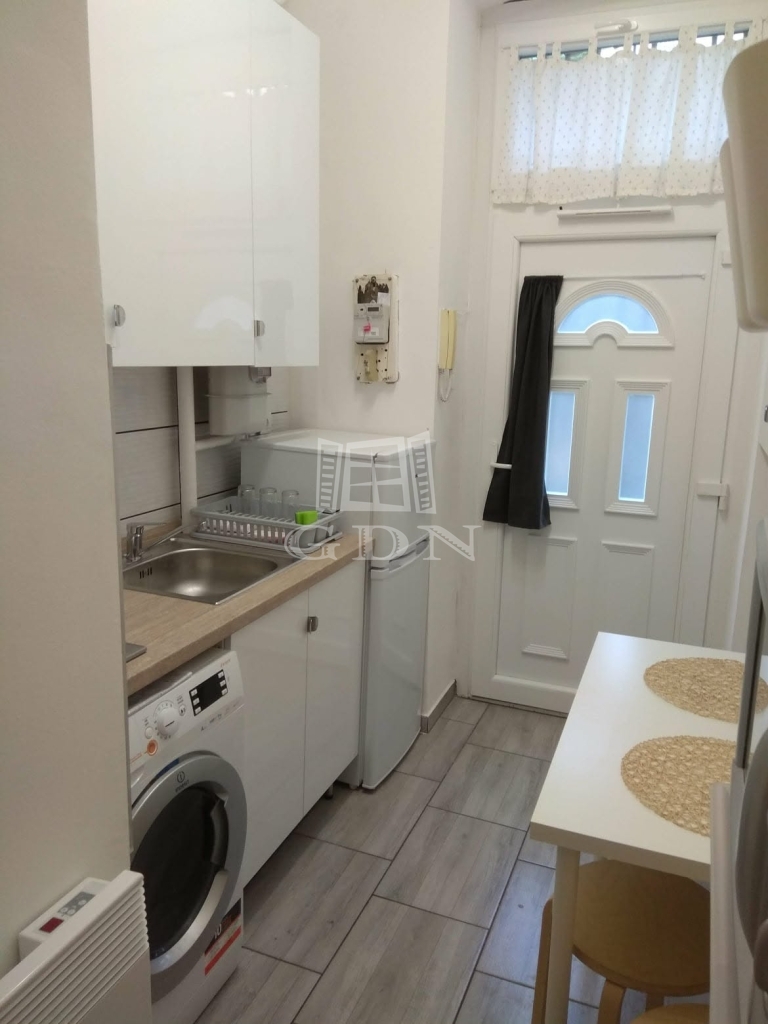 A praktikusan kialakított konyha beépített szekrénnyel, elektromos főzőlappal és páraelszívóval felszerelt, továbbá itt kapott helyet a szárítós mosógép és a hűtő is – ezek mind a vételár részét képezik. A fürdőszobában zuhanytálca található.