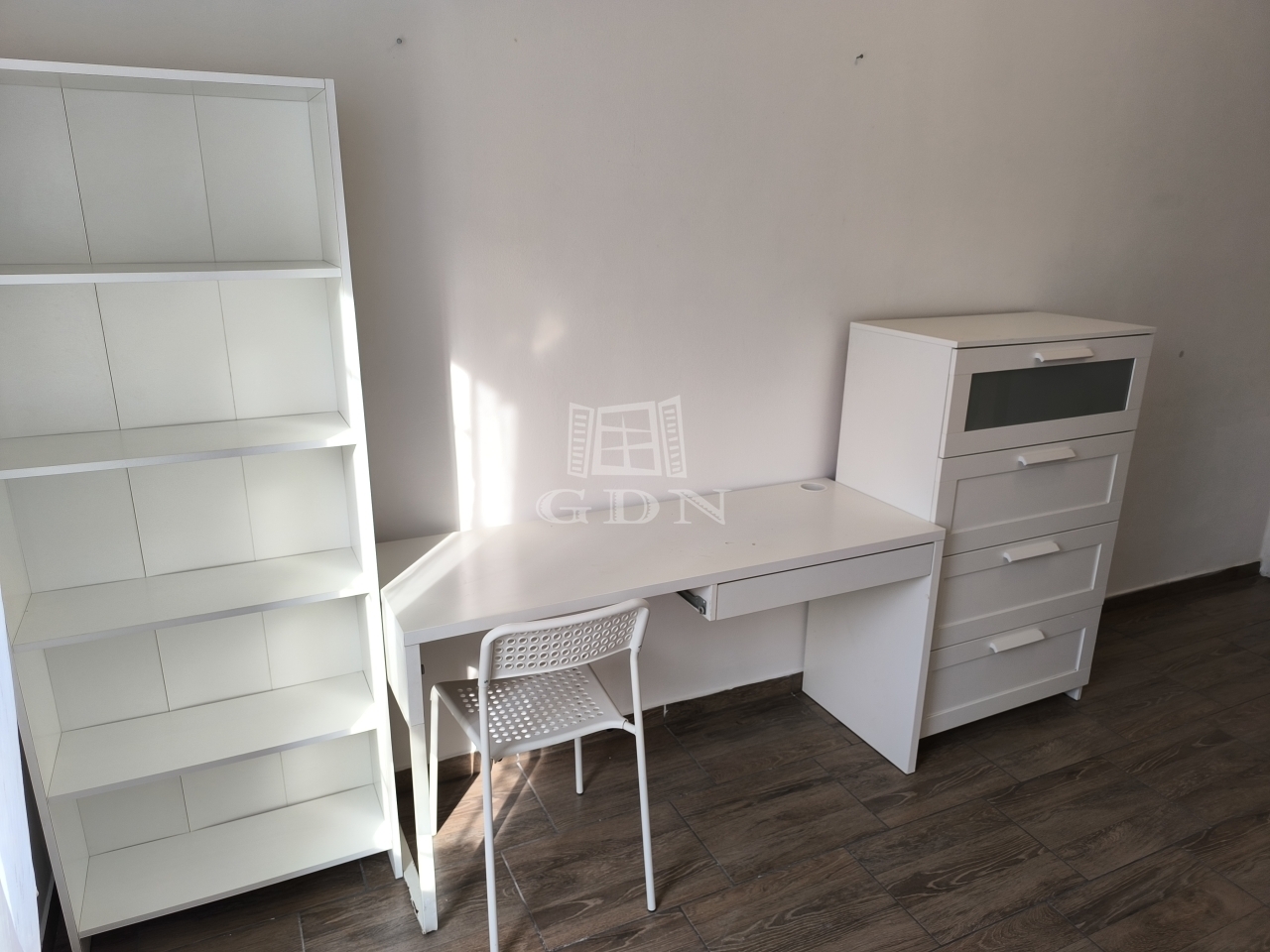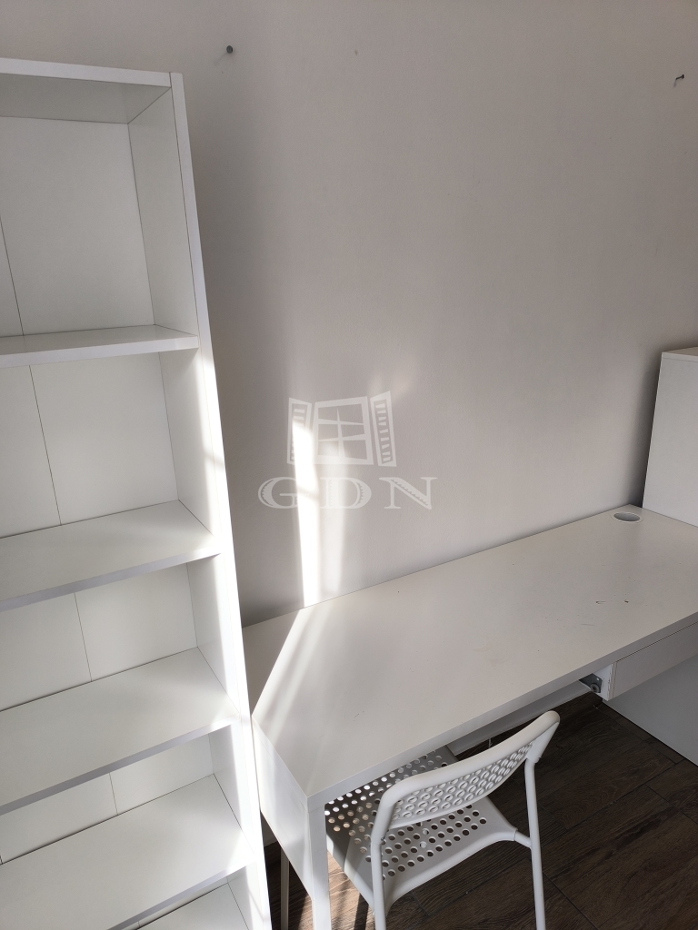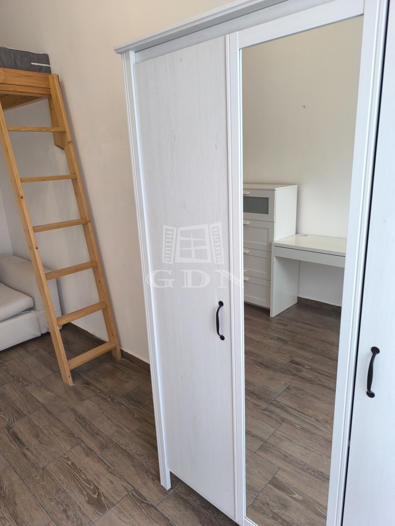 A világos, kb. 15 m²-es szoba járólappal burkolt, és egy egyedi, fenyőből készült fekvőgalériával rendelkezik (160x200 cm), amely jelentősen növeli a tér kihasználhatóságát. Az ablak redőnnyel felszerelt.