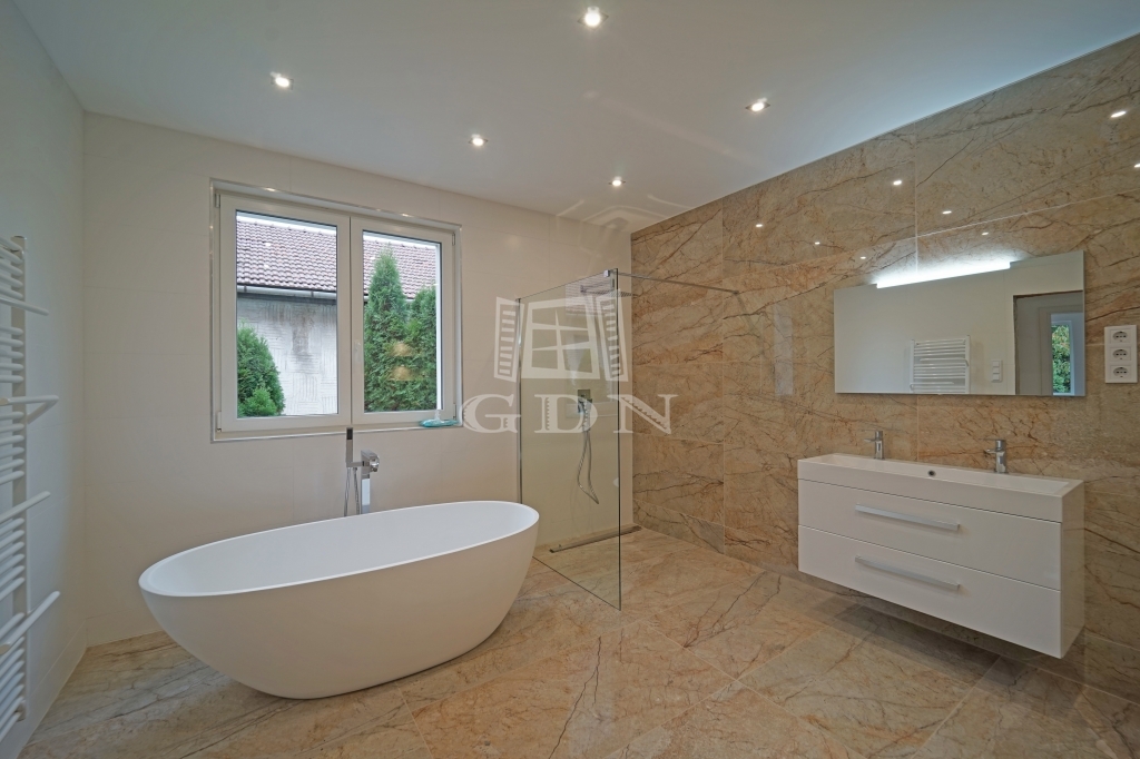 A minőség fontos szempont volt a kilakításnál, a földszinten a padlót 60x120-as márvány lapokkal burkolták, a lépcsőház korlátai rozsdamentes acél és üveg kombóval készültek, a három fürdőszoba szaniterei, bútorai és csaptelepei az Arezzo Design termékeiből lettek ízlésen kiválasztva.