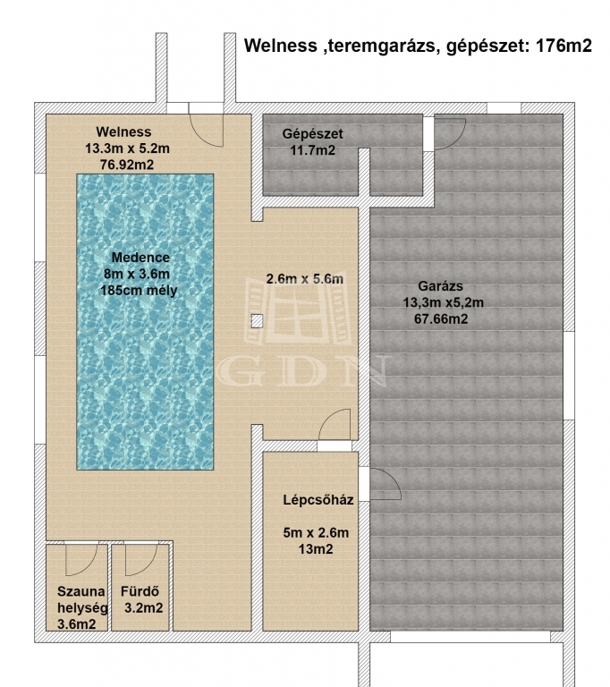 Külön kazán biztosítja a szuterén szinten elhelyezkedő 8x3,6 méteres 185 cm mély medence fűtését.