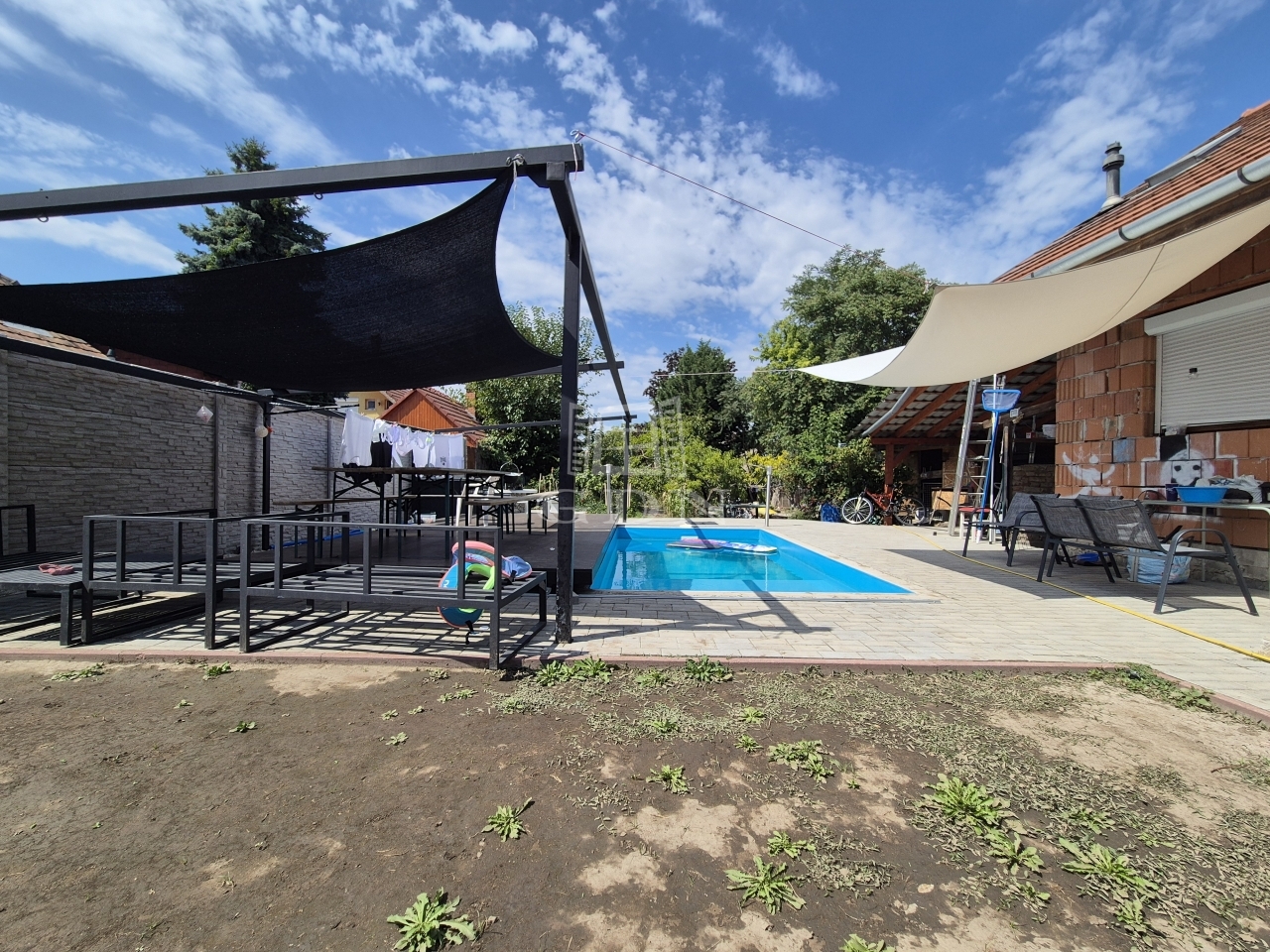 Dunaharaszti egyik kedvelt, lakóparki részén, kitűnő ellátottság mellett, aszfaltozott mellékutcából nyíló, 1150 m²-es összközműves, kúttal, medencével, több autó számára parkolási lehetőséggel rendelkező telken kínálunk eladásra egy két házat magába foglaló ingatlant.