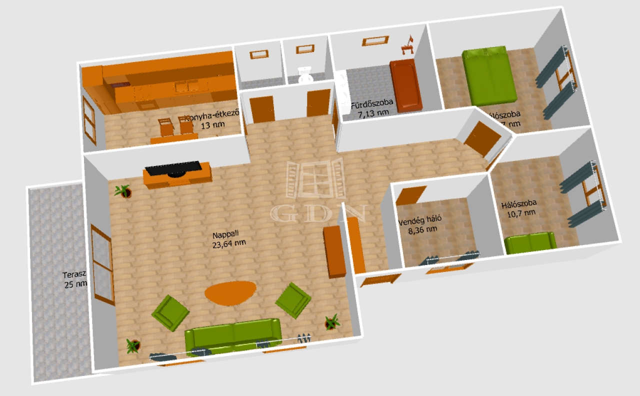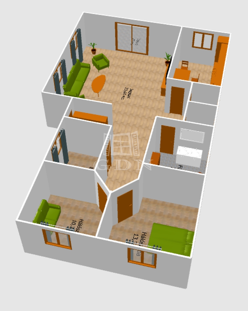 - belső elosztás: nappali, konyha (vadonatúj háztartási gépekkel felszerelt), fürdőszoba, WC, háztartási helyiség, 3 hálószoba, közvetlen kertkapcsolatos nagy terasz,