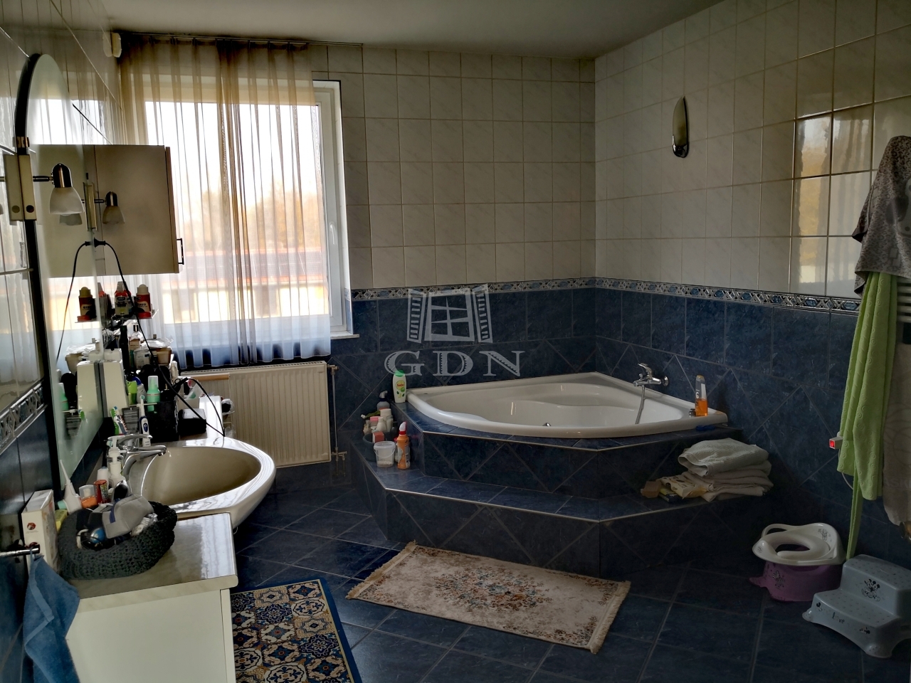 Az épület kert felőli részén nagy méretű, 70 nm-es déli tájolású hangulatos panorámás terasz van kialakítva, melynek egyik oldalán helyezkedik el a nappali, konyha, étkező, a másik oldalán pedig 3 hálószoba, gardrób 2 fürdőszoba és a WC. Az ablakok úgy helyezkednek el, hogy bárhol is vagyunk a házban, mindenhonnan látható a kert és a saját 150 nm-es halas tó.